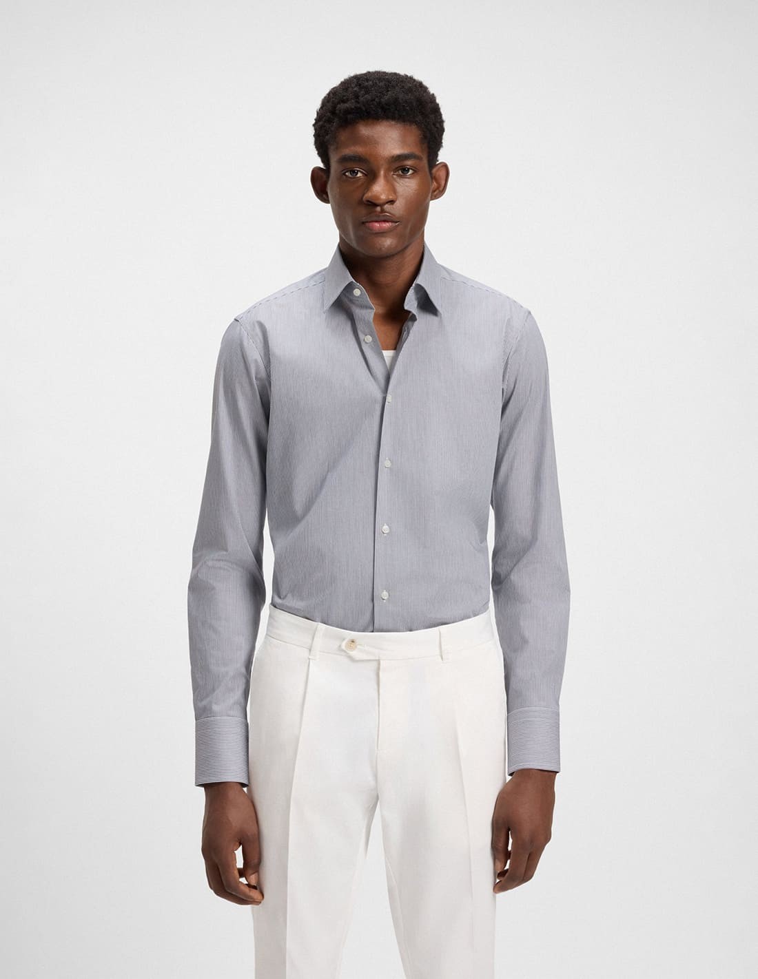 Αναβαθμίστε το επαγγελματικό σας στυλ με αυτό το εκλεπτυσμένο ανδρικό πουκάμισο BOSS, σχεδιασμένο σε λεπτή ρίγα για διακριτική κομψότητα. Κατασκευασμένο από ελαστικό βαμβακερό twill με easy-iron επεξεργασία για εύκολο σιδέρωμα και άνεση που διαρκεί όλη μέρα. Ιδανικό για απαιτητικές καθημερινές εμφανίσεις ή business περιβάλλον, αυτό το πουκάμισο συνδυάζει λειτουργικότητα, στυλ και την υψηλή ποιότητα που χαρακτηρίζει την ανδρική ένδυση BOSS. Ένα must-have κομμάτι για κάθε σύγχρονη ανδρική γκαρνταρόμπα.