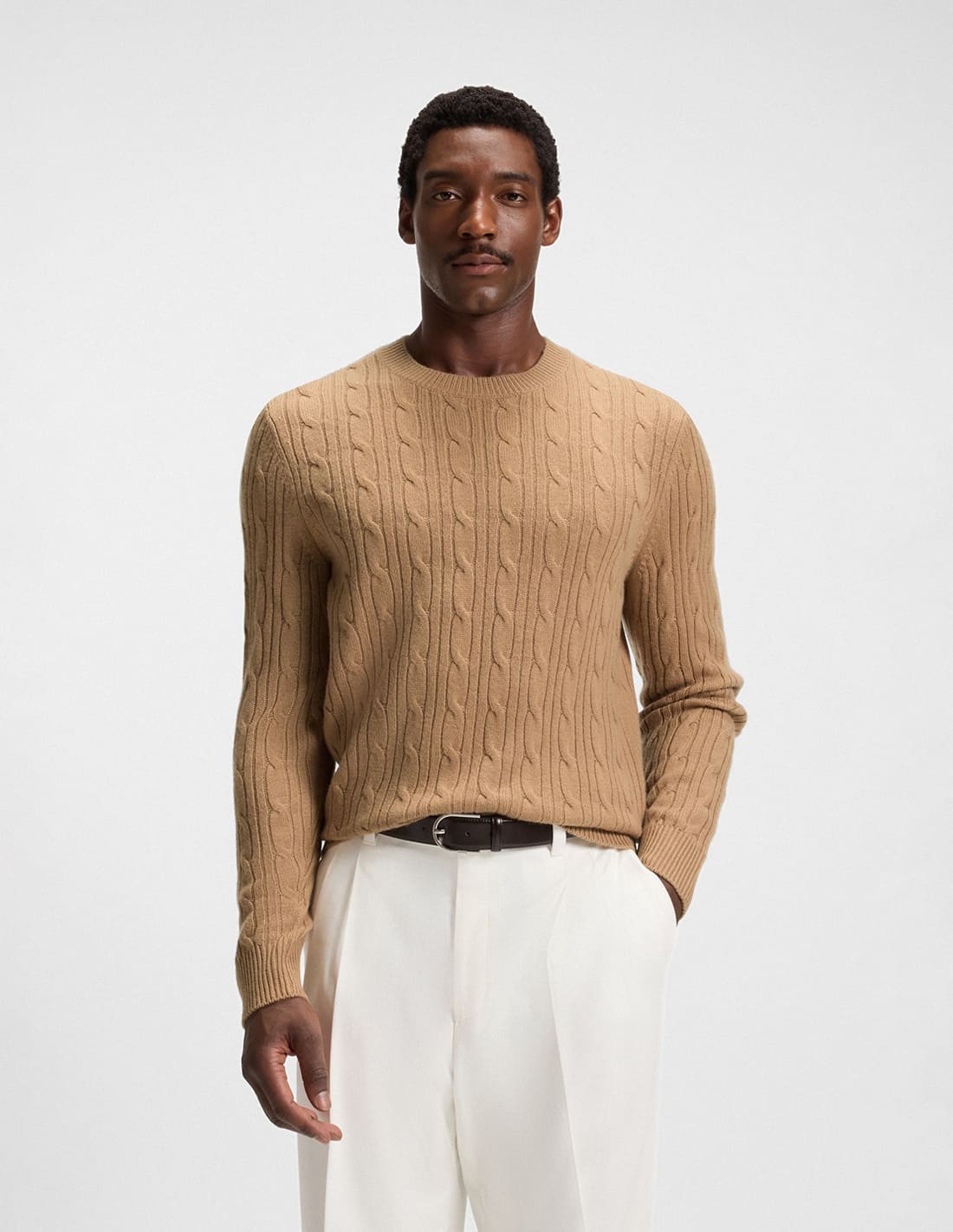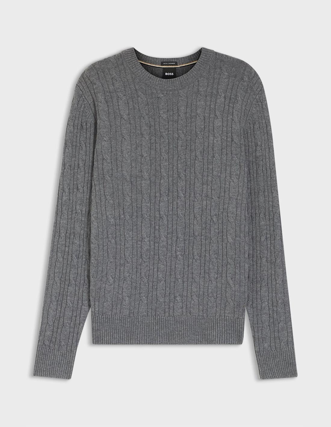Αναβαθμίστε το καθημερινό σας στυλ με αυτό το πολυτελές ανδρικό πουλόβερ από τη συλλογή BOSS Menswear. Πλεγμένο με διαχρονική πλέξη “ψαροκόκαλο” (cable knit), συνδυάζει παρθένο μαλλί με εκλεκτό κασμίρ για απαλή υφή, φυσική θερμομόνωση και διαχρονική κομψότητα. Με άνετη, κανονική εφαρμογή, αποτελεί ιδανική επιλογή για κομψές casual εμφανίσεις με premium χαρακτήρα.