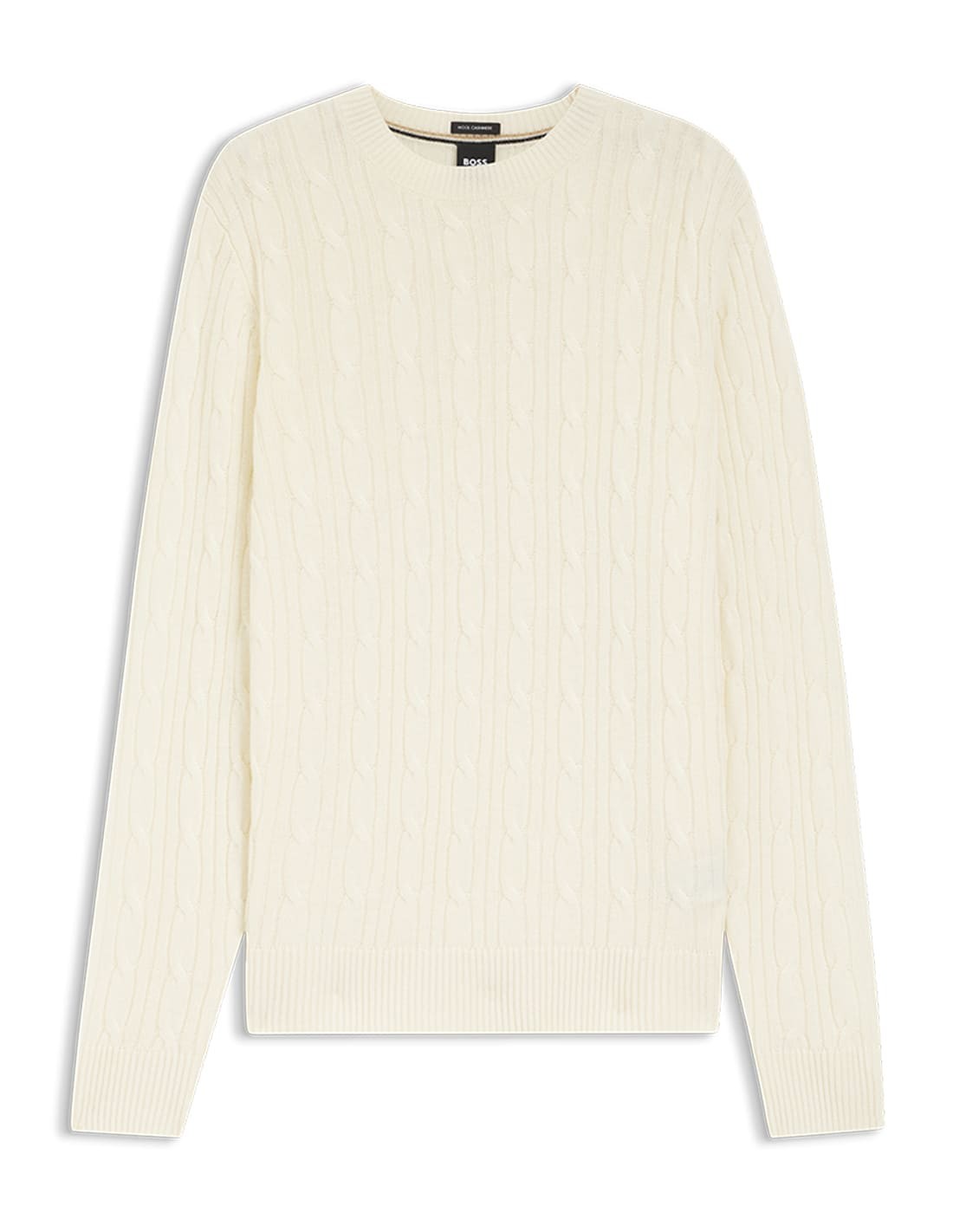 Αναβαθμίστε το καθημερινό σας στυλ με αυτό το πολυτελές ανδρικό πουλόβερ από τη συλλογή BOSS Menswear. Πλεγμένο με διαχρονική πλέξη “ψαροκόκαλο” (cable knit), συνδυάζει παρθένο μαλλί με εκλεκτό κασμίρ για απαλή υφή, φυσική θερμομόνωση και διαχρονική κομψότητα. Με άνετη, κανονική εφαρμογή, αποτελεί ιδανική επιλογή για κομψές casual εμφανίσεις με premium χαρακτήρα.