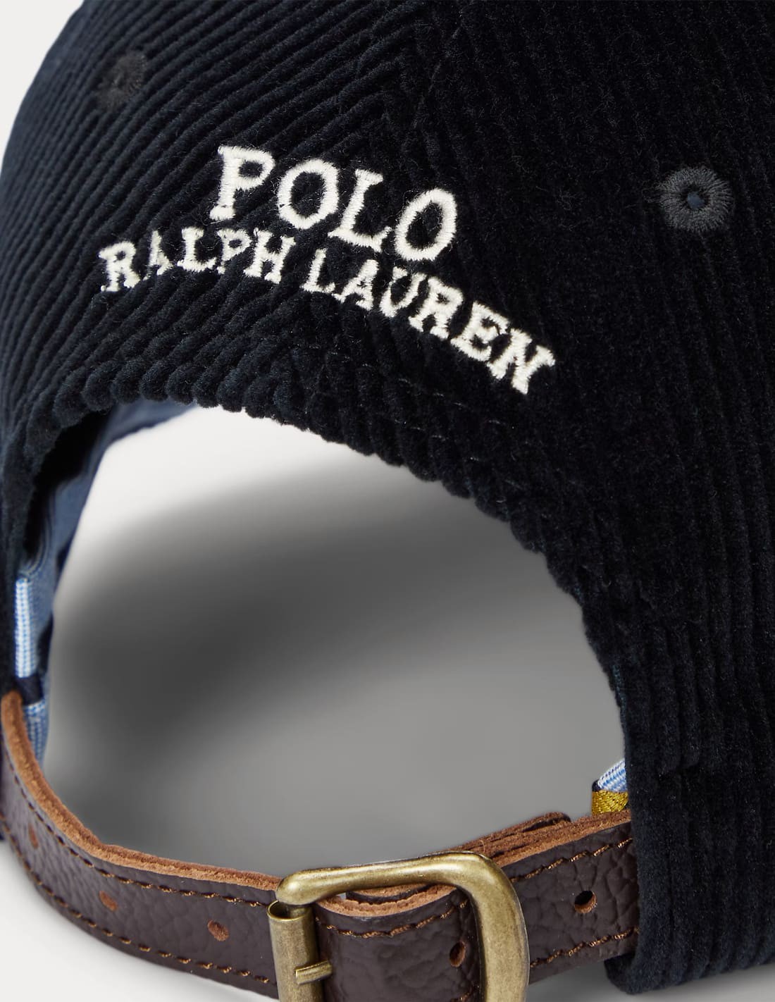 Ralph Lauren’s multicoloured signature embroidered Pony accents this corduroy ball cap, which is finished with a buckled leather strap at the back.