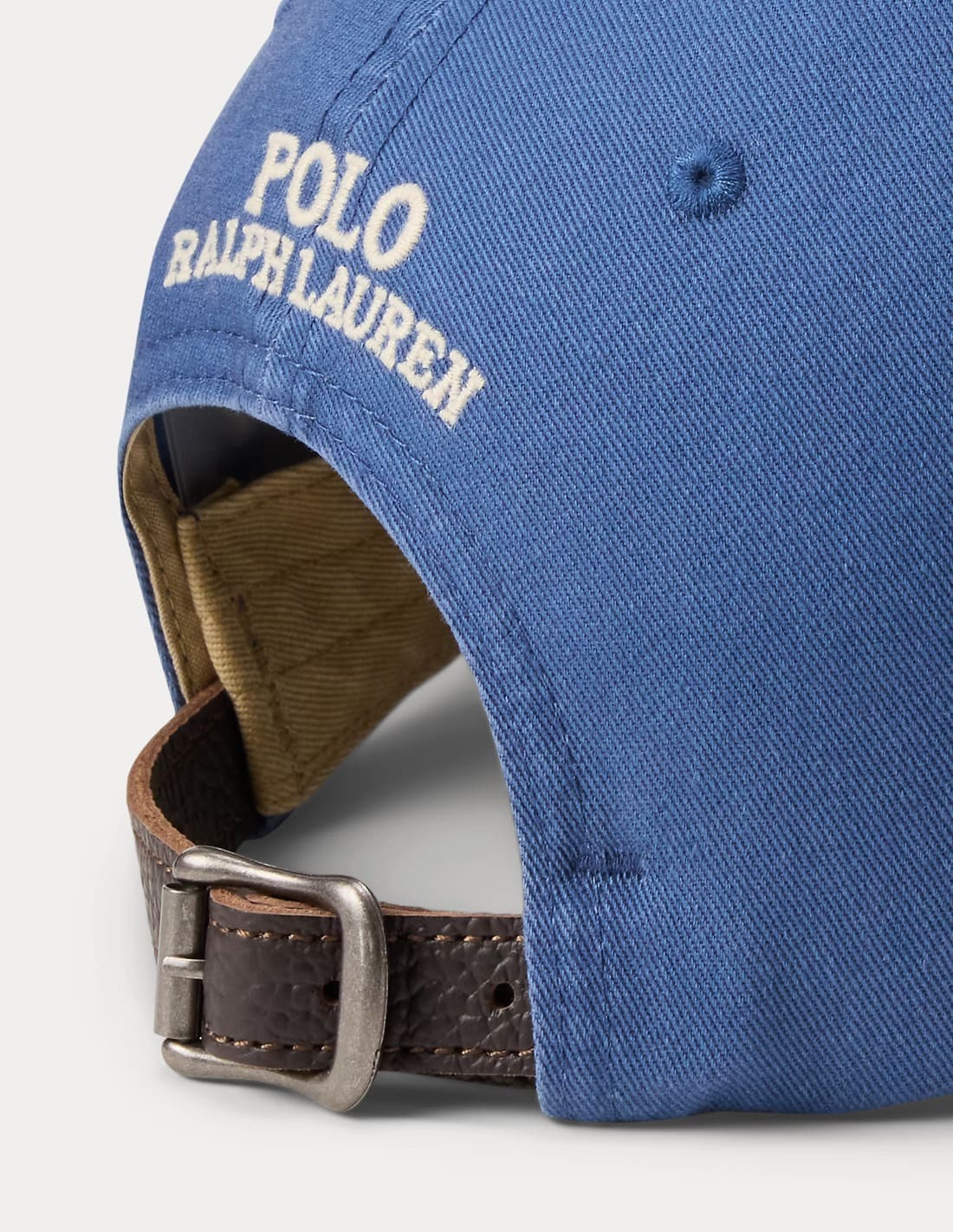 - "Polo Ralph Lauren" embroidery and a buckled leather strap on the back