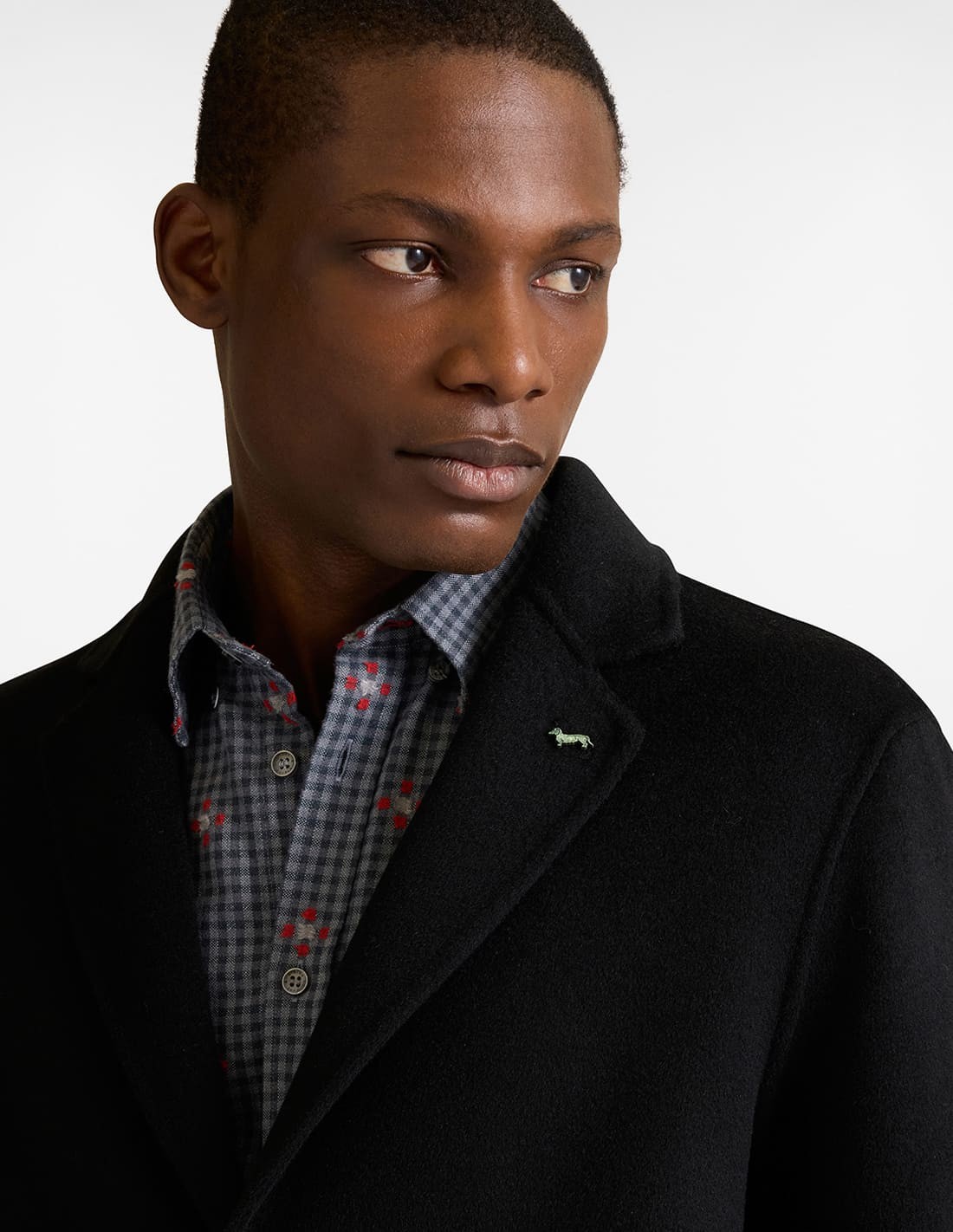 A winter wardrobe classic reimagined with clean lines and contemporary style. This men's long coat is made from fine, warm, and compact wool and features a single-breasted closure with three buttons, a notch lapel collar, and patch pockets that add functionality to the essential design. The dachshund pin applied to the lapel signs the garment with the unmistakable elegance of Harmont & Blaine. Perfect for the city and the season's more formal looks.