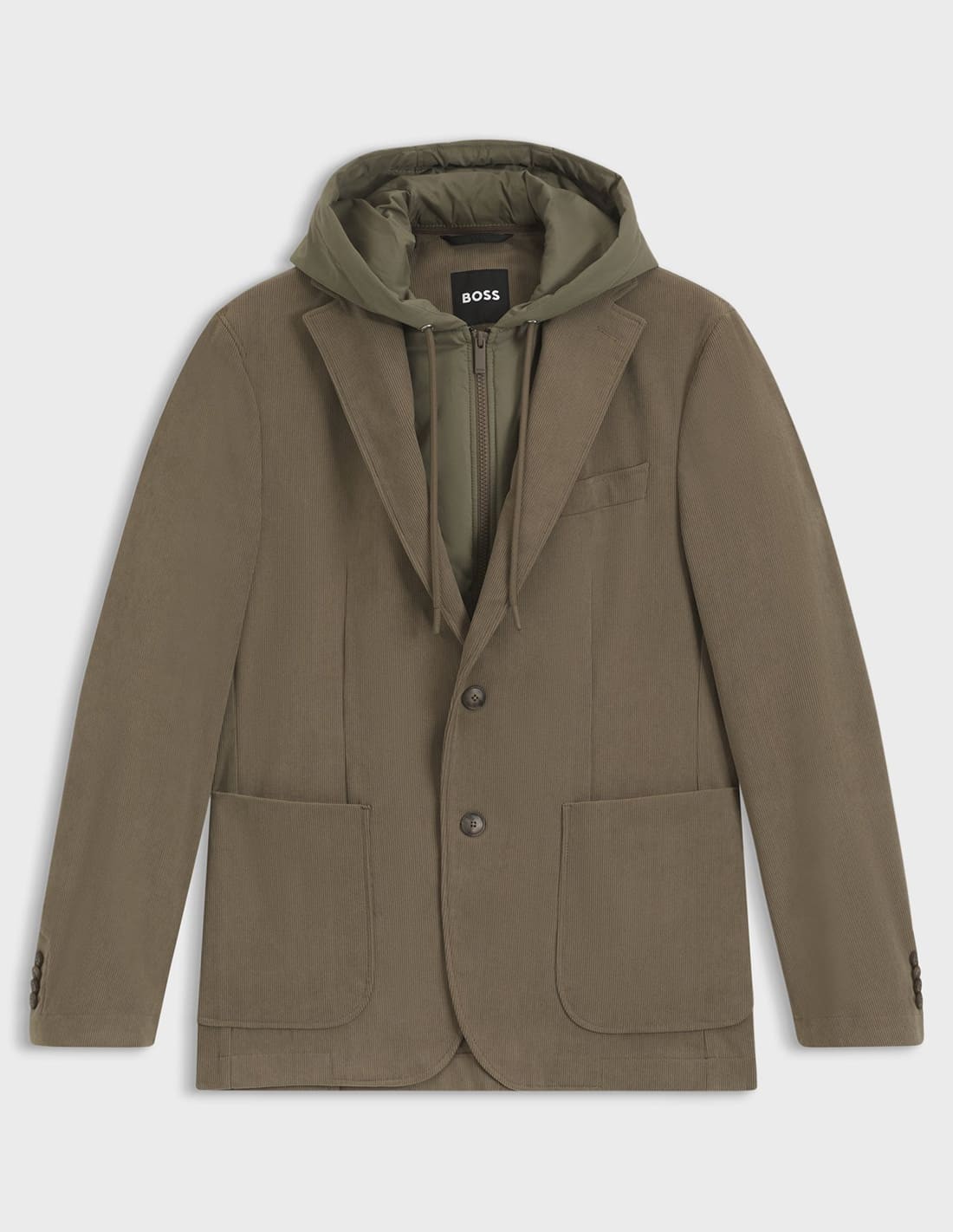 In performance corduroy with added stretch, this slim-cut BOSS Menswear jacket is a versatile investment. Packable design with integrated zip-up hoodie.
