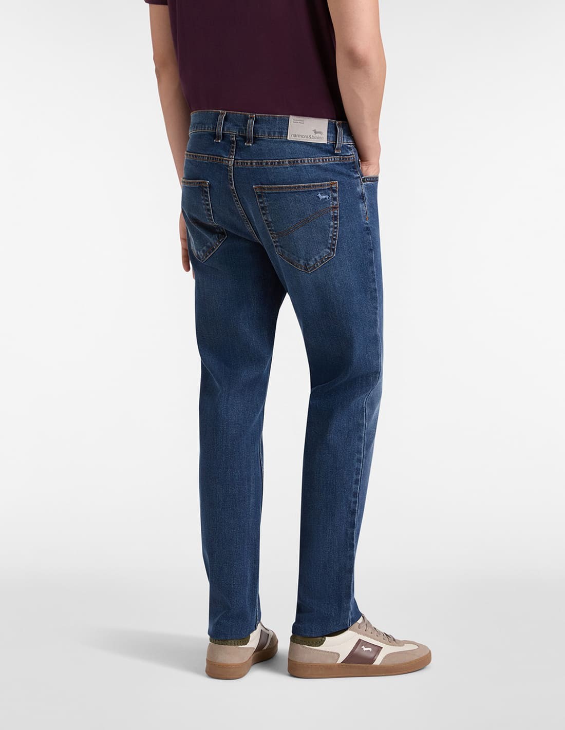 ESSENTIALS stretch cotton trousers with 5 pockets, contrasting topstitching and iconic Blaine dachshund embroidered on the back. Narrow fit.