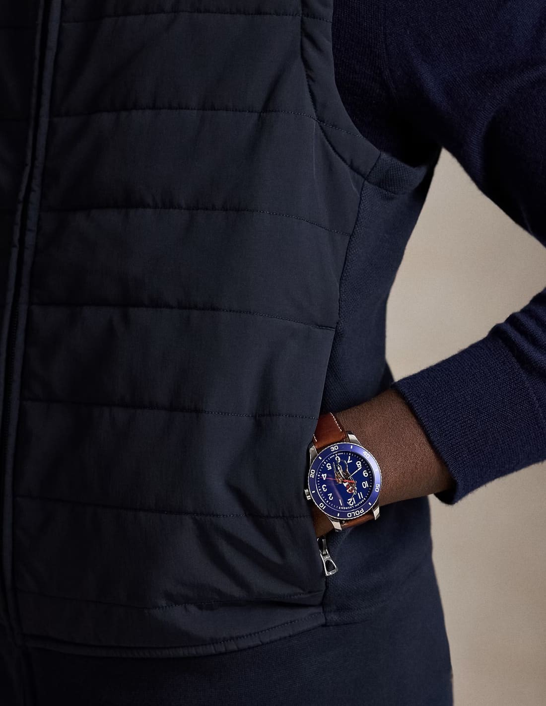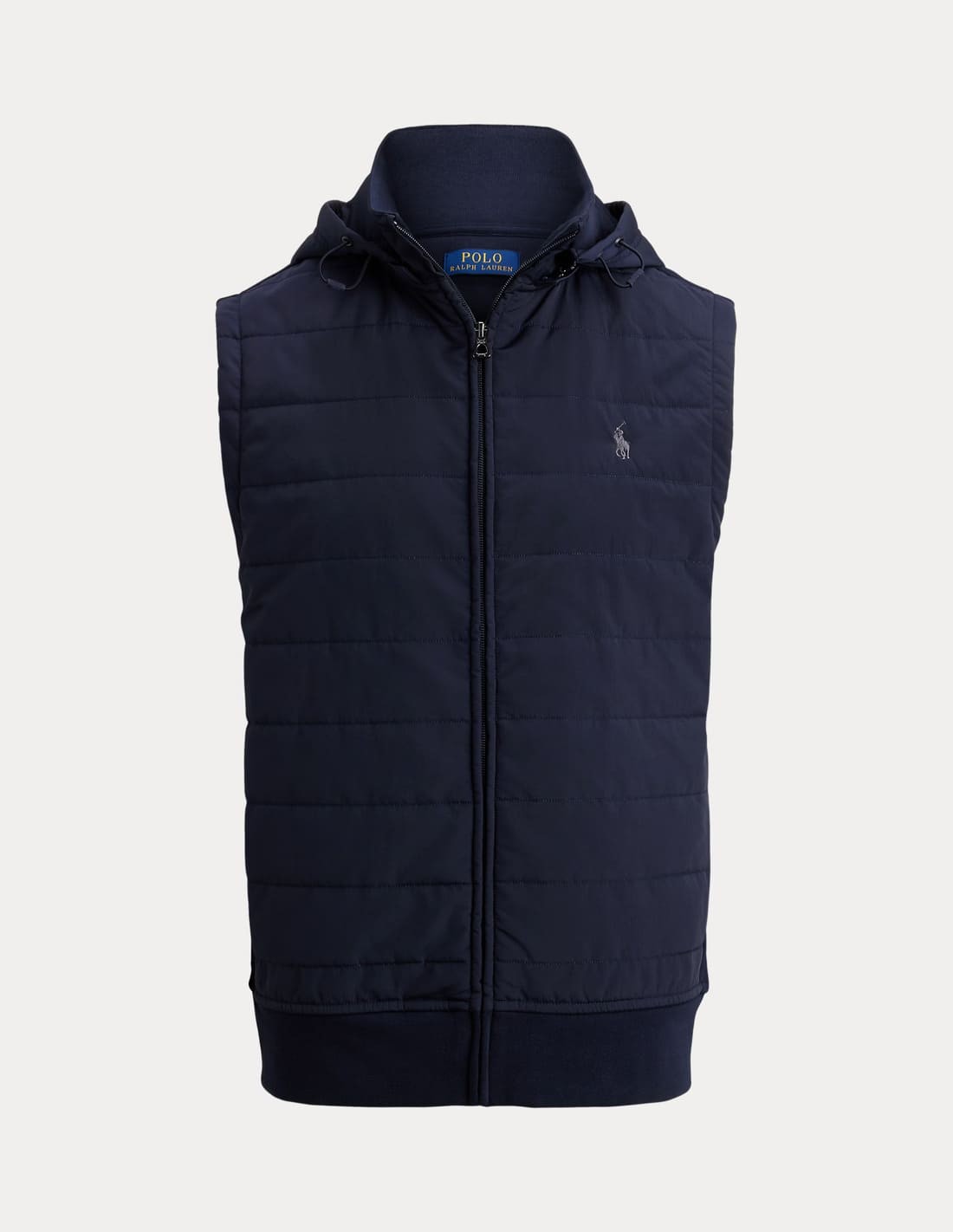 This gilet is crafted from a mesh-textured version of the double-knit fabric and built with a contrasting quilted panel that’s insulated for added warmth. A zip-off drawstring hood provides added protection against the elements.