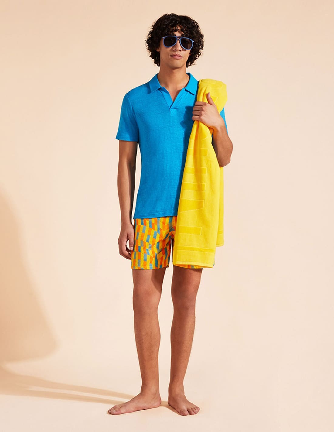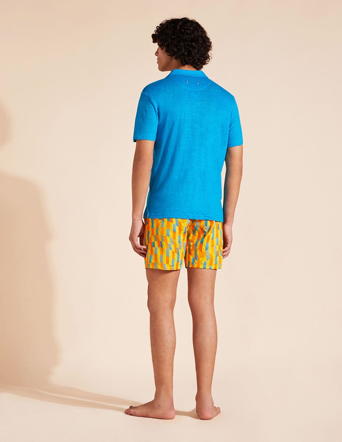 With its lightweight, linen jersey fabric, the Pyramid men's polo shirt adds a smart touch to any casual outfit and is ideal for very hot days as it feels weightless against the skin. Its simple, straight cut combines with short sleeves, a buttonless placket and two eyelets at the back. The essential Vilebrequin turtle is embroidered in a tone-on-tone colour on the chest.