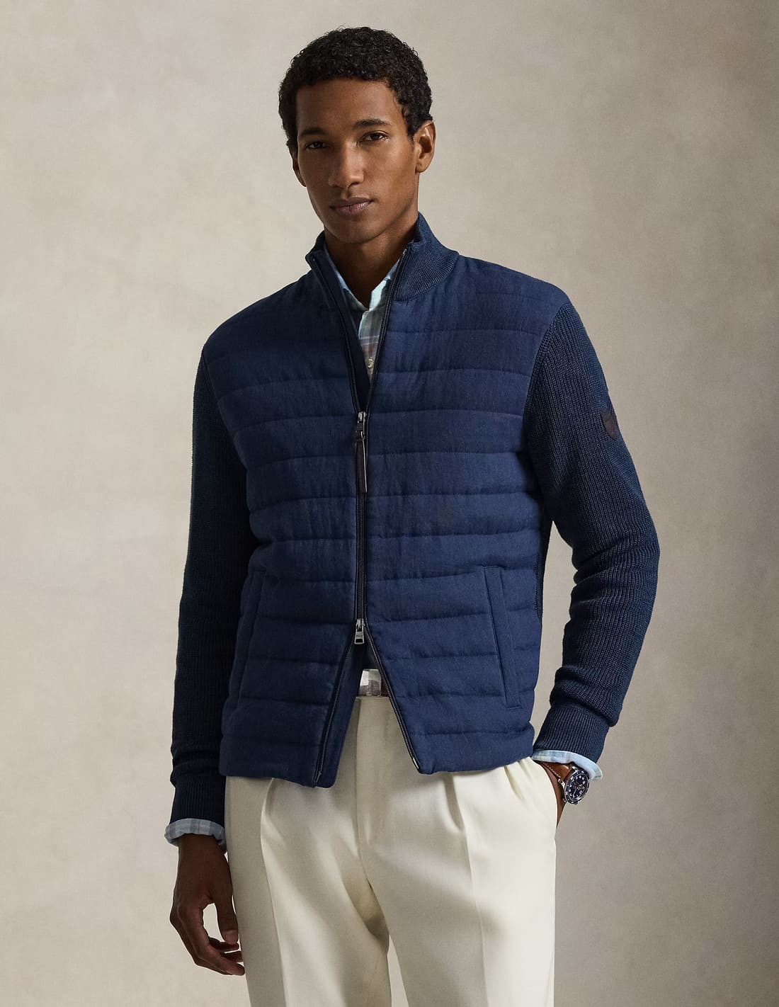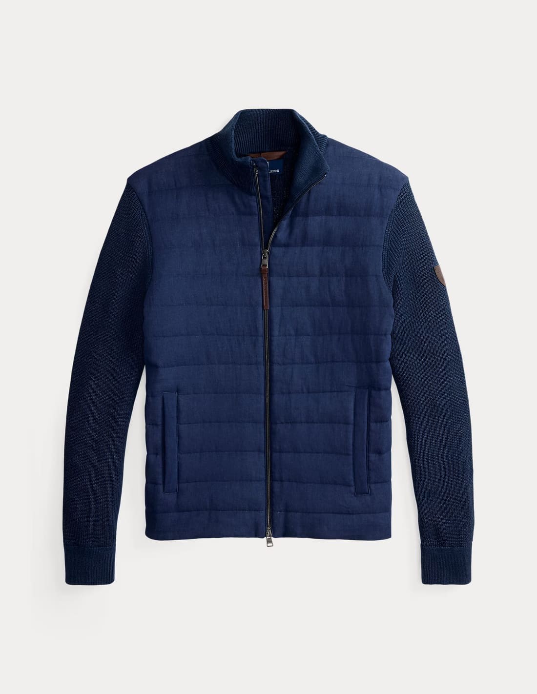 This full-zip jumper utilises lightweight, breathable linen in two forms—woven fabric at the front and knit throughout the body—for an elevated take on texture.