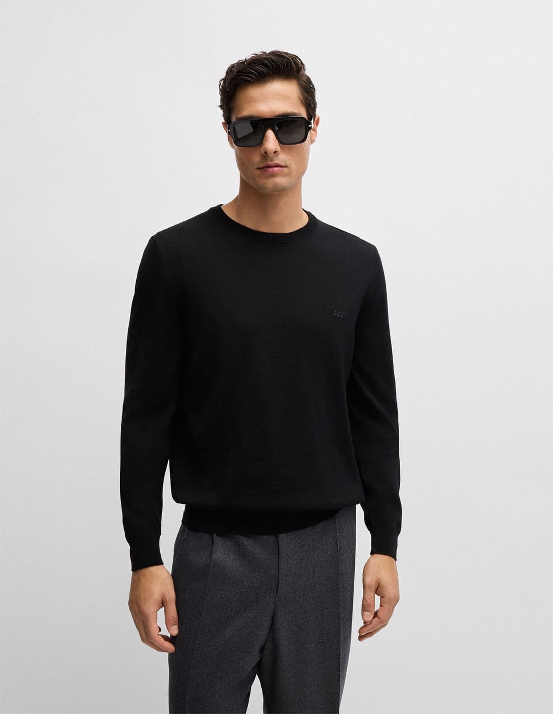 Crafted in temperature-regulating virgin wool, this BOSS Menswear sweater is essential to any man's wardrobe. Embroidered logo. Regular fit with crew neckline.