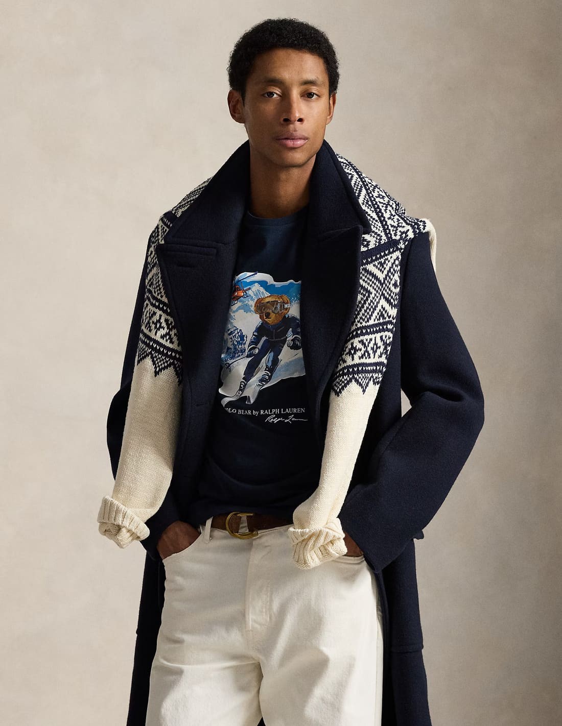Inspired by classic spy films, this jersey T-shirt features a snowy landscape with a helicopter and the beloved Polo Bear skiing in style.